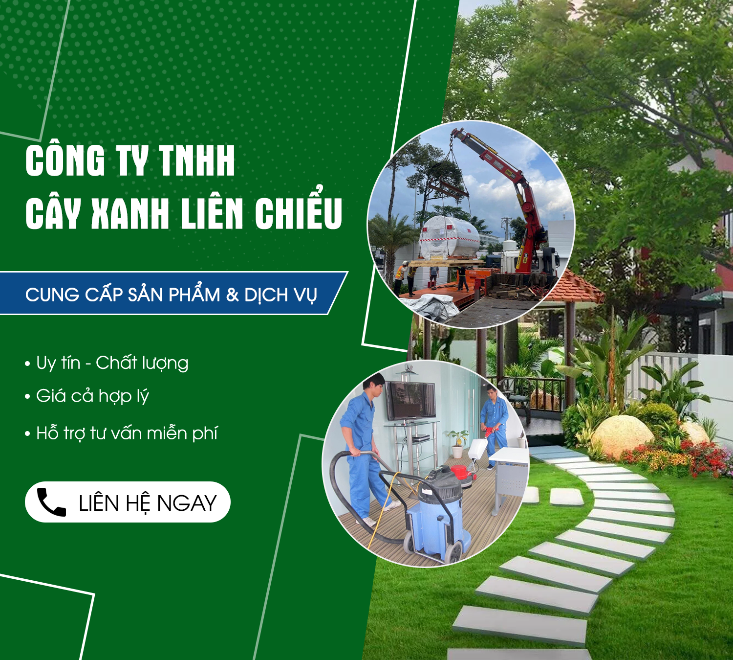 Công Ty TNHH Cây Xanh Liên Chiểu cung cấp đa dạng dịch vụ cây xanh, dịch vụ cẩu tải và vệ sinh công nghiệp chuyên nghiệp, đáp ứng toàn diện nhu cầu cho cá nhân, doanh nghiệp và công trình. Chúng tôi chuyên trồng cây, thiết kế cảnh quan sân vườn, cắt tỉa tạo dáng, chăm sóc cây xanh định kỳ, chặt hạ và di dời cây xanh, mang đến không gian xanh bền vững, thẩm mỹ và hài hòa cho mọi công trình.